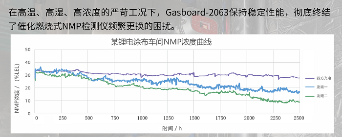 国内某锂电池涂布车间,陆续在三个月的实测数据显示,欧博ABG环保NMP检测器运行稳定,实现免维护、无衰减、无中毒;而另外两家友商的催化燃烧式检测器,已出现明显衰减,测试数据偏差达到50%以上。